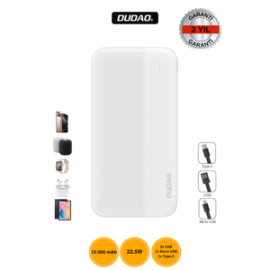 Bu Dudao 10.000 mAh kapasiteli power bank, 22.5W hızlı şarj desteği ile cihazlarınızı her an, her yerde şarj etmenizi sağlar. Hem 2 USB, 1 Micro USB, hem de 1 Type-C bağlantı noktaları sayesinde aynı anda birden fazla cihazı şarj edebilir ve çok yönlü kullanım sunar. Kompakt ve hafif tasarımı, çantada kolayca taşınabilir ve günlük hayatınızın vazgeçilmez bir parçası olur. 2 yıllık garanti ile birlikte gelen bu power bank, dayanıklılığı ve güvenliği garanti eder. Telefonlar, kulaklıklar, akıllı saatler ve tabletlerle uyumludur, böylece tüm cihazlarınızı her an şarj edebilme rahatlığını yaşarsınız.