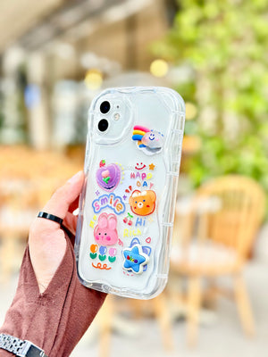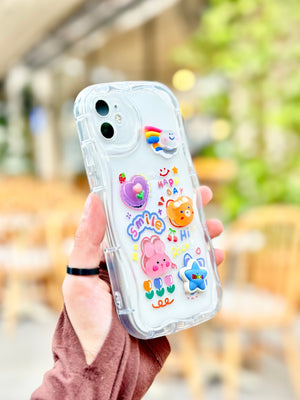 Telefonunuza mutluluk katın! Bu sevimli ve renkli telefon kılıfı, 3D figürlerle zenginleştirilmiş benzersiz bir tasarım sunuyor. Kılıf üzerinde yer alan gülen bulut, tatlı ayıcık, neşeli tavşan, yıldız ve diğer sevimli figürler, her anınıza renk katacak. “Hello,” “Life is Lovely,” ve “Happy” gibi pozitif mesajlarla süslenmiş olan bu kılıf, enerjik ve pozitif bir ruh hali yansıtıyor. Şeffaf yapısı, telefonunuzun orijinal rengini sergilerken, esnek ve dayanıklı malzemesi ile çizilmelere ve darbelere karşı etkili koruma sağlar. Hem işlevsel hem de estetik bir aksesuar arayanlar için ideal bir tercih!