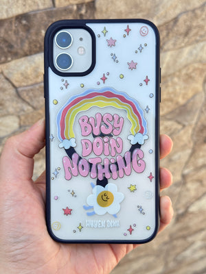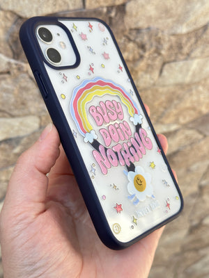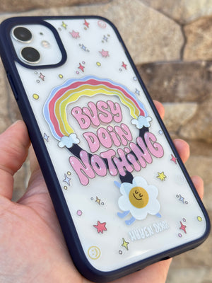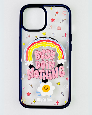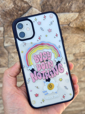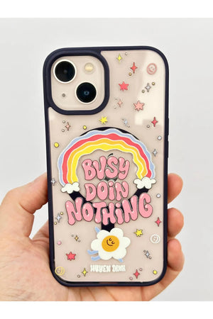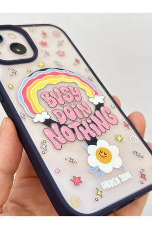 Bu, bir mobil cihaza ait koruyucu bir aksesuardır. Kılıf, arka yüzeyinde ve kenarlarında çeşitli renkli ve stilize edilmiş görsel öğeler barındırmaktadır. Merkezde, gökkuşağı formunda bir tasarım üzerinde "BUSY DOING NOTHING" ifadesi yer almaktadır. İfadenin etrafında yıldız, daire ve gülen yüz gibi farklı semboller serpiştirilmiştir. Alt kısımda, stilize edilmiş bir çiçek figürü ve küçük bir yazı bulunmaktadır. Kılıfın kenarları koyu renkli olup, kamera lensleri için özel açıklıklar mevcuttur.