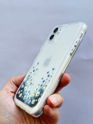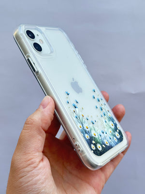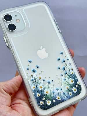 iPhone 11 Parlak Metal Tuşlu Beyaz Mavi Papatya Desenli Kılıf