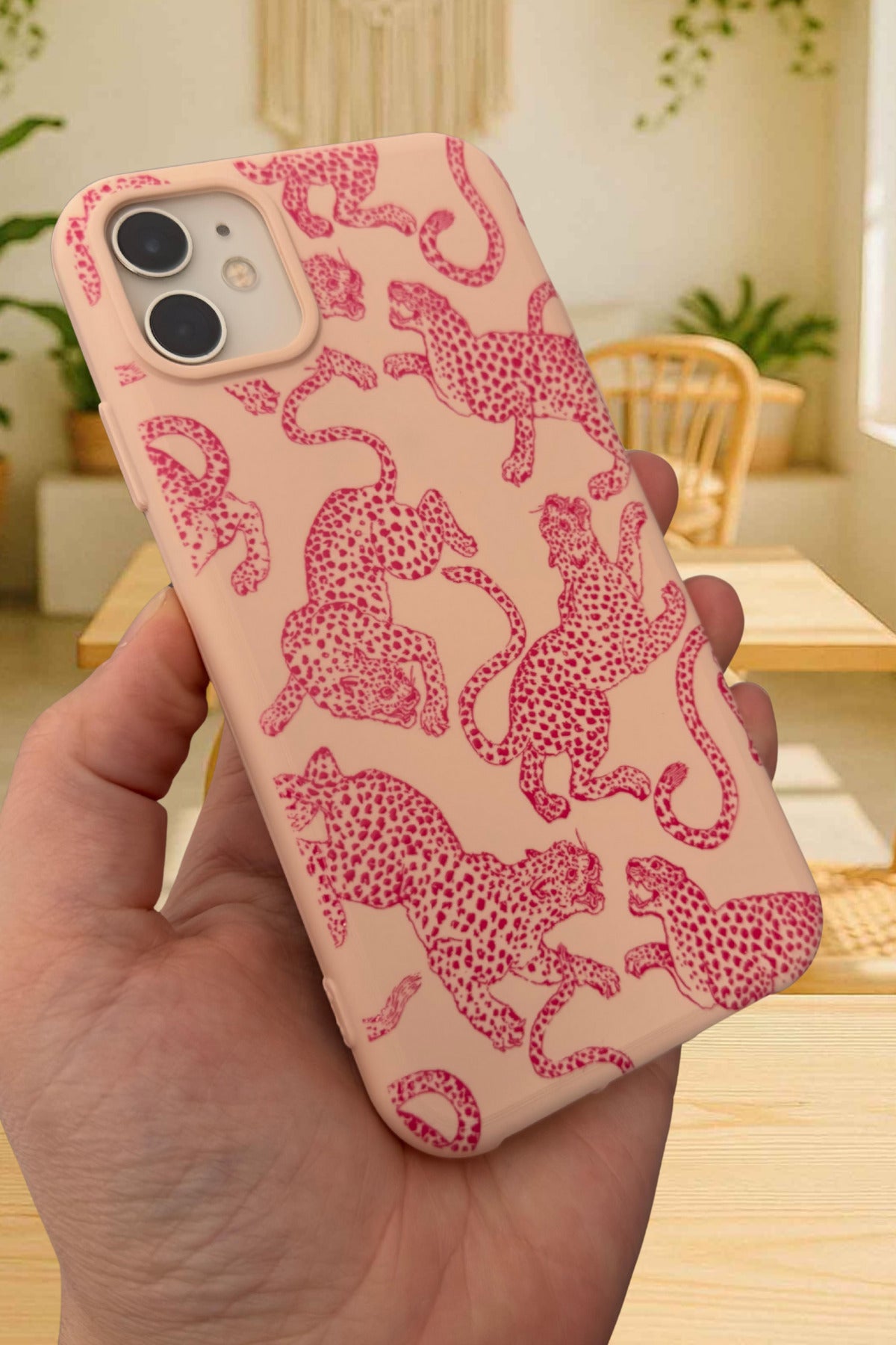 iPhone 11 Uyumlu Pembe Leopar Desenli Silikon Darbe Emici Klasik Korumalı Rubber Kılıf