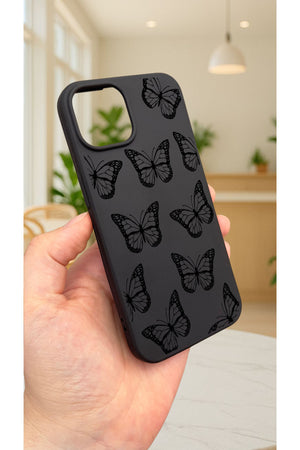 iPhone 12 ve 12 Pro Uyumlu SİYAH KELEBEK DESENLİ Silikon Darbe Emici Klasik Korumalı Rubber Kılıf
