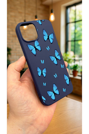 iPhone 13/14 - MAVİ KELEBEK DESENLİ Silikon Darbe Emici Klasik Korumalı Rubber Kılıf