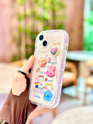 Telefonunuza mutluluk katın! Bu sevimli ve renkli telefon kılıfı, 3D figürlerle zenginleştirilmiş benzersiz bir tasarım sunuyor. Kılıf üzerinde yer alan gülen bulut, tatlı ayıcık, neşeli tavşan, yıldız ve diğer sevimli figürler, her anınıza renk katacak. “Hello,” “Life is Lovely,” ve “Happy” gibi pozitif mesajlarla süslenmiş olan bu kılıf, enerjik ve pozitif bir ruh hali yansıtıyor. Şeffaf yapısı, telefonunuzun orijinal rengini sergilerken, esnek ve dayanıklı malzemesi ile çizilmelere ve darbelere karşı etkili koruma sağlar. Hem işlevsel hem de estetik bir aksesuar arayanlar için ideal bir tercih!