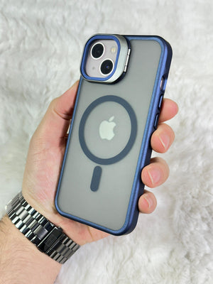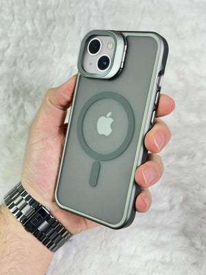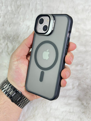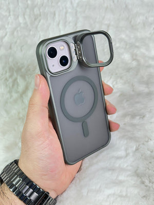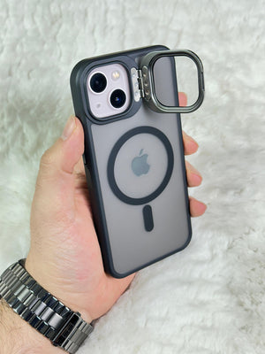 iPhone 13 Açılabilir Kamera Koruyucu Cam ve Stand Olabilen Arkası Mat Yanları Sert Silikon Duda Magsafe
