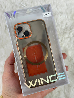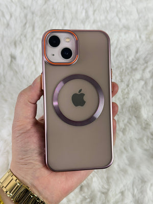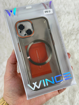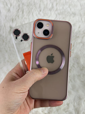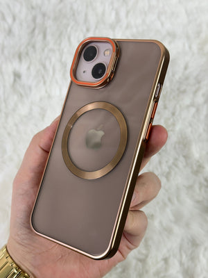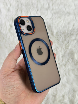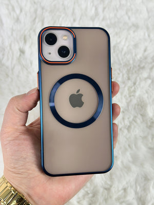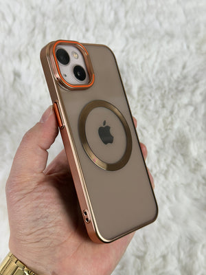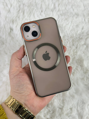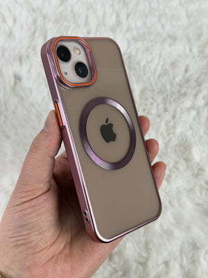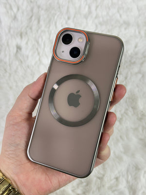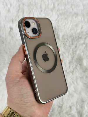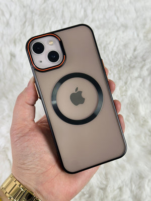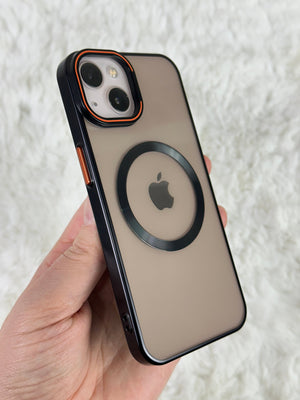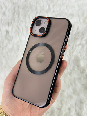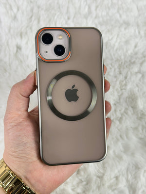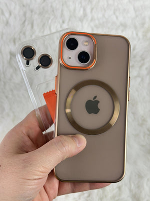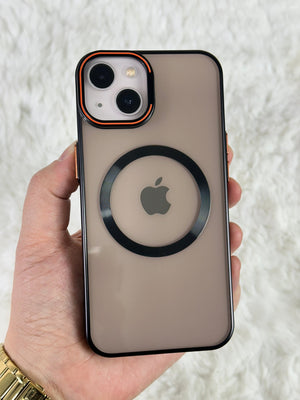 Bu görüntüde MagSafe özellikli şeffaf bir iPhone 13/14 kılıfı gösteriliyor. Kılıfın öne çıkan özellikleri: Şeffaf tasarım - telefonun orijinal rengini ve Apple logosunu göstermeye olanak sağlıyor MagSafe uyumlu - Arka kısımda görünen metal halka MagSafe şarj ve aksesuarları için Turuncu renkli vurgular - kamera modülü