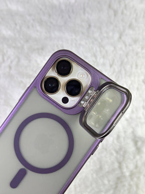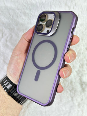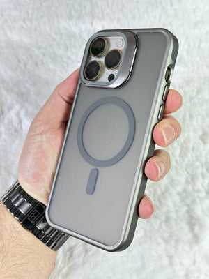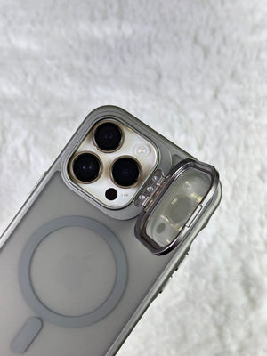 iPhone 14 Pro Max ile Uyumlu Açılabilir Kamera Koruyucu Cam ve Stand Olabilen Arkası Mat Yanları Sert Silikon Duda Magsafe