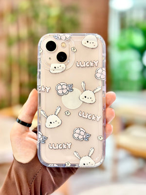 iPhone 14 Tavşan ve Çiçek Desenli Şeffaf Telefon Lucky Kılıfı