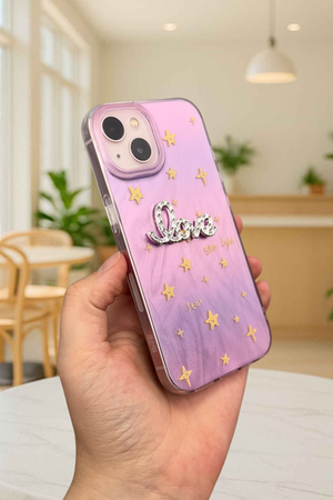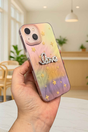 iPhone 15 Parlak Taşlı “Love” Yazılı Yıldız Desenli Telefon Kılıfı – Pastel Renkli Star Love Kılıf