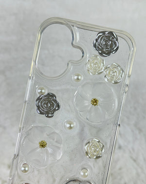 iPhone 16 3D Çiçek Desenli İnci Detaylı Pearl Kılıf