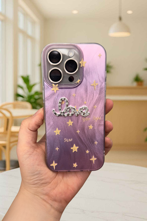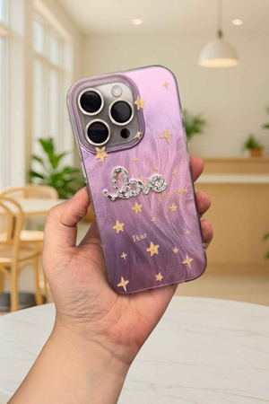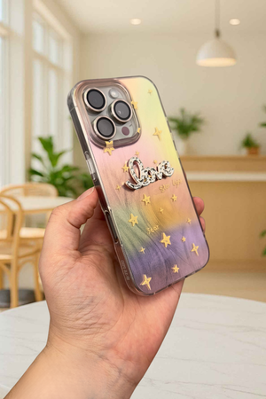 iPhone 16 Pro Max Parlak Taşlı “Love” Yazılı Yıldız Desenli Telefon Kılıfı – Pastel Renkli Star Love Kılıf