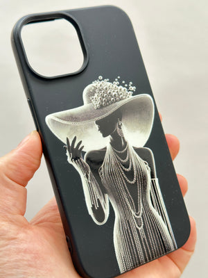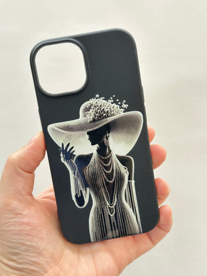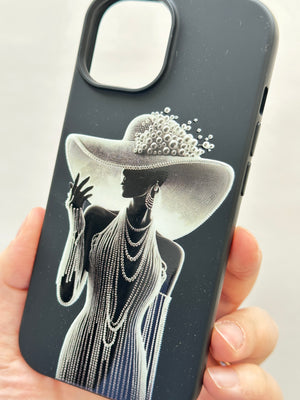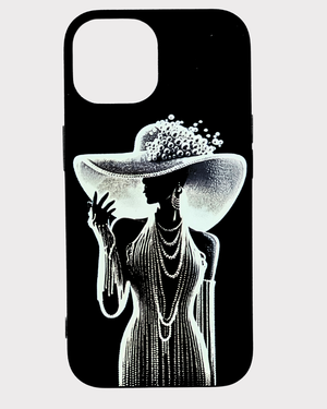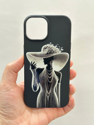 Bu siyah telefon kılıfı, zarafeti ve gösterişi bir araya getiren etkileyici bir tasarıma sahip. Kılıfın üzerinde, geniş kenarlı, incilerle süslenmiş bir şapka takan, uzun ve zarif bir elbise giymiş bir kadın silueti yer alıyor. Kadının boynunda kat kat inci kolyeler ve parmağında dikkat çekici bir yüzük bulunuyor. Uzun eldivenleri ve duruşu, ona sofistike ve gizemli bir hava katıyor.