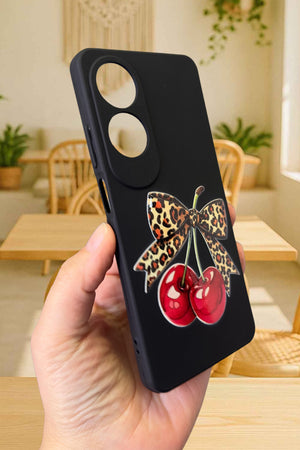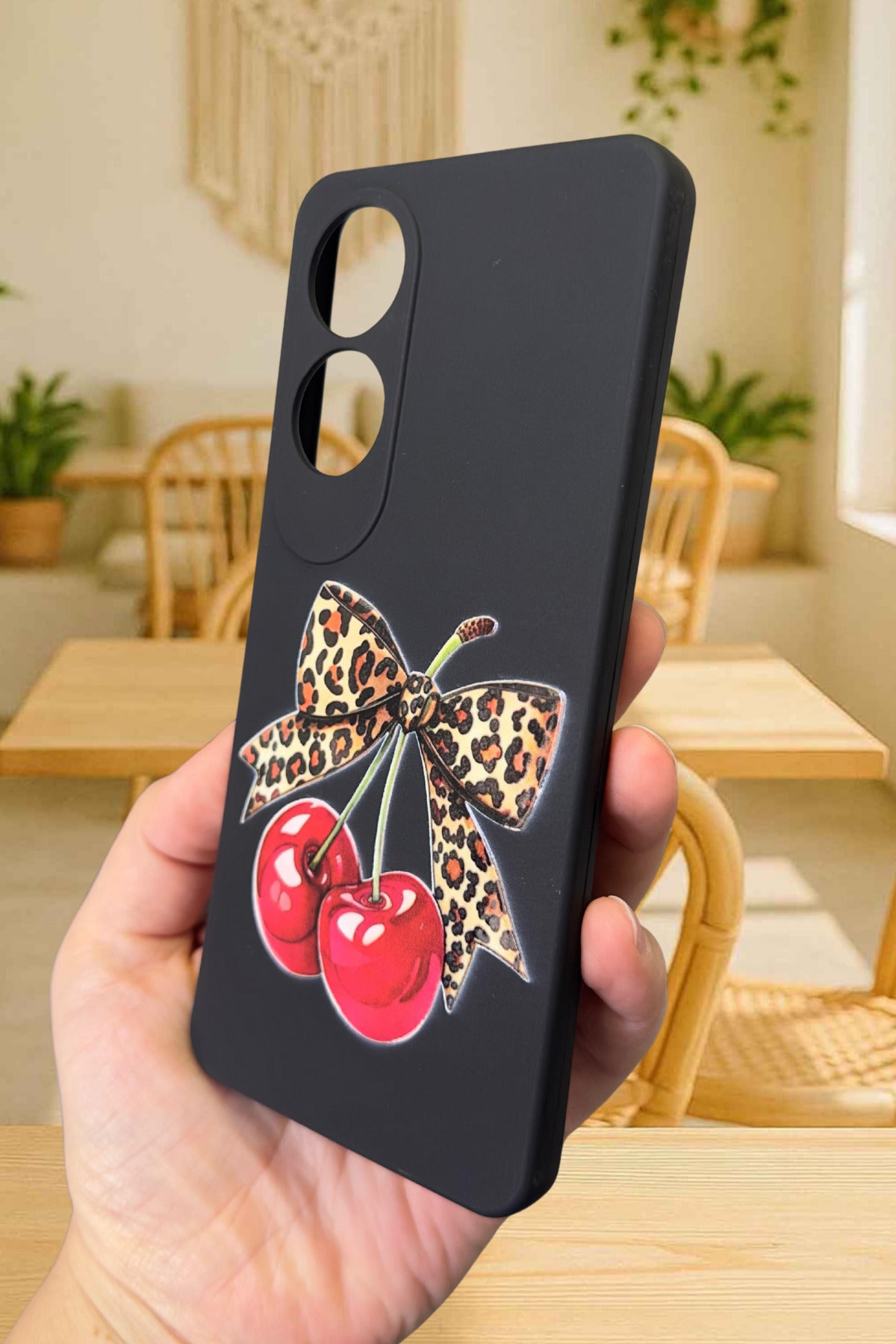 Oppo A60 Uyumlu Kiraz Leopar Fiyonk Desenli Silikon Darbe Emici Klasik Korumalı Rubber Kılıf