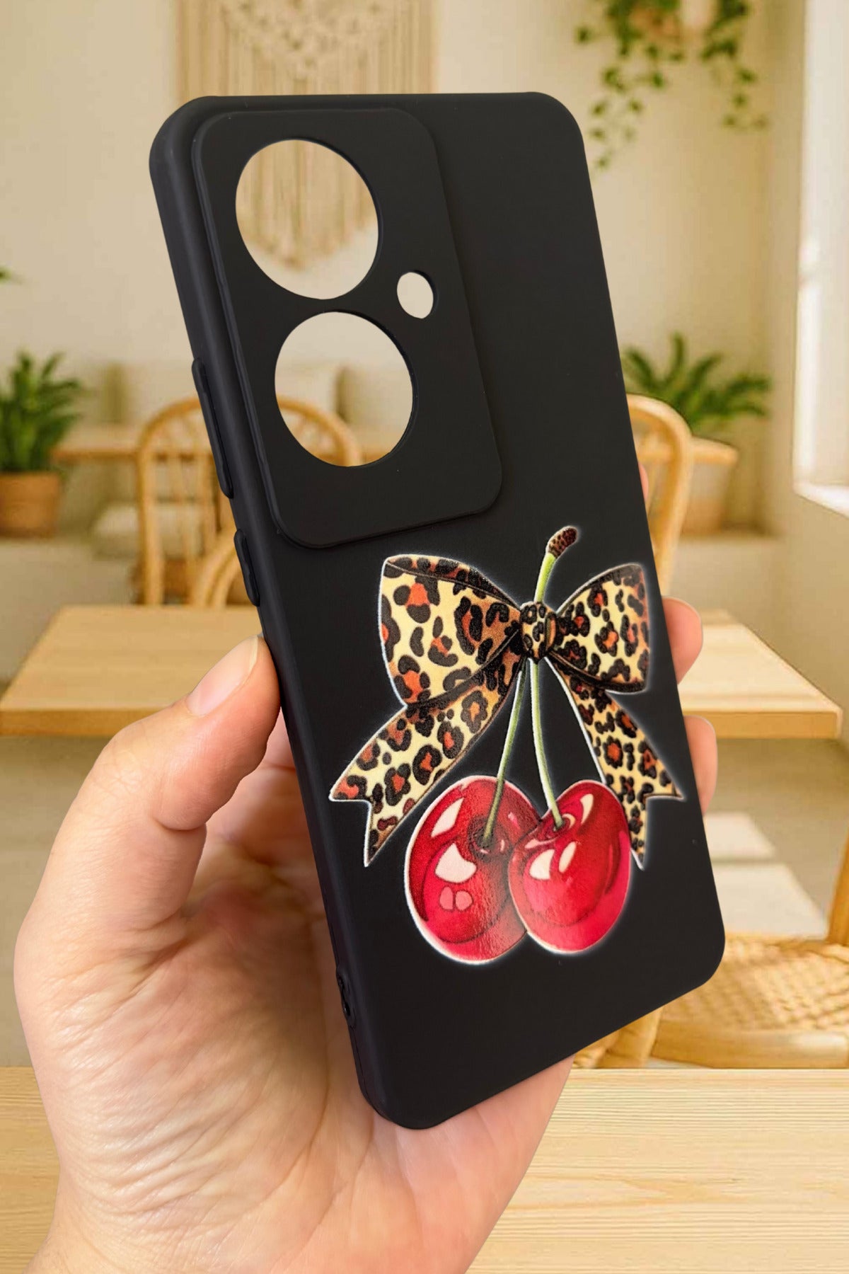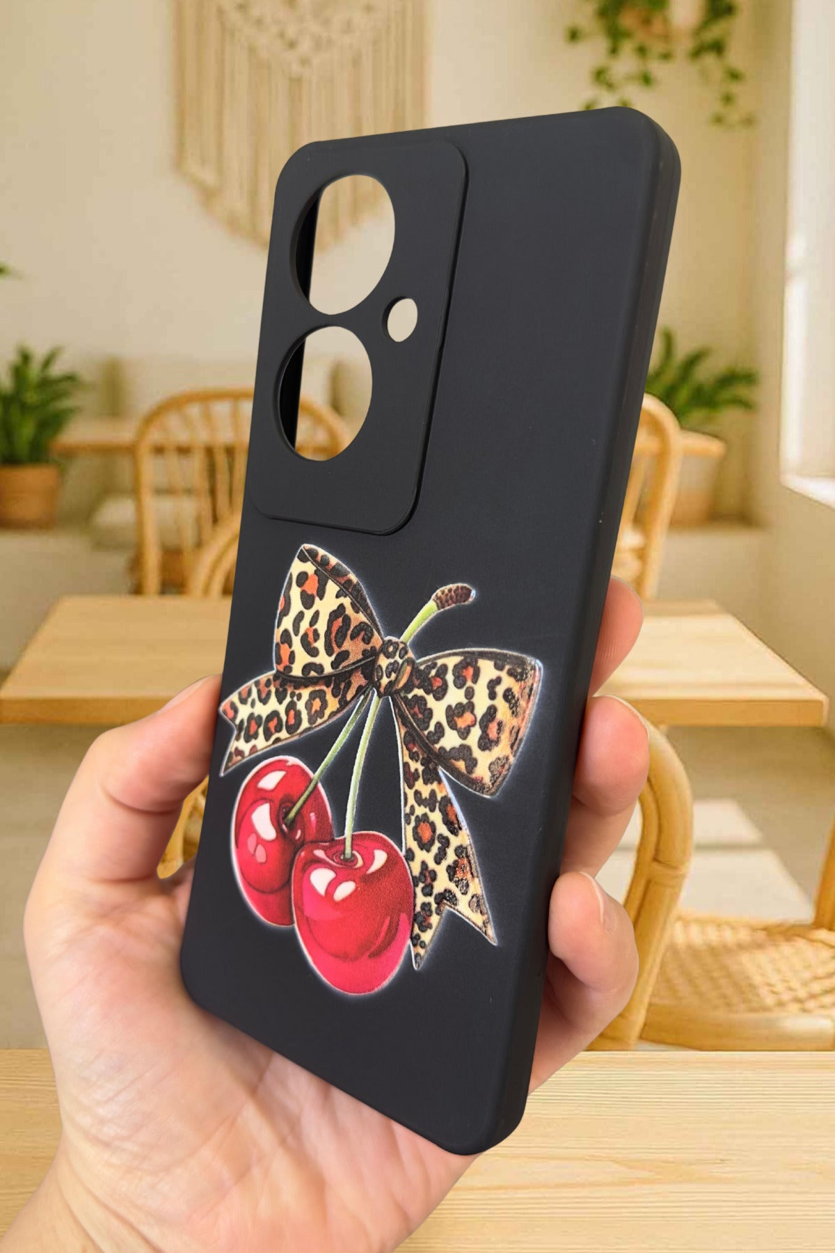 OPPO RENO 11F Uyumlu Kiraz Leopar Fiyonk Desenli Silikon Darbe Emici Rubber Kılıf