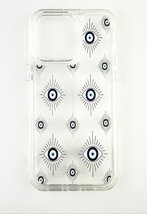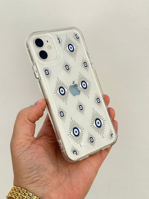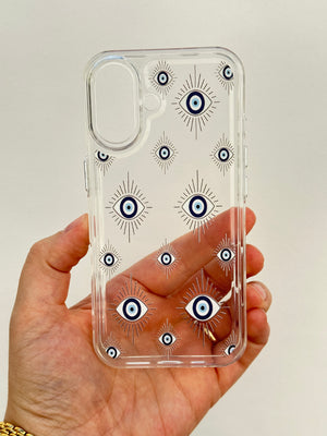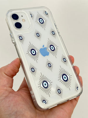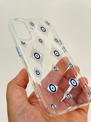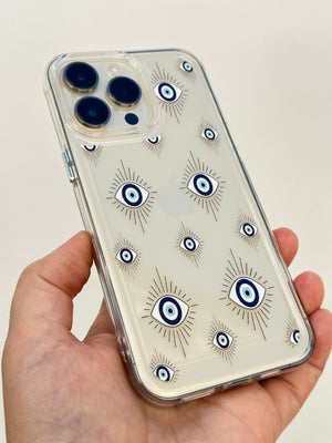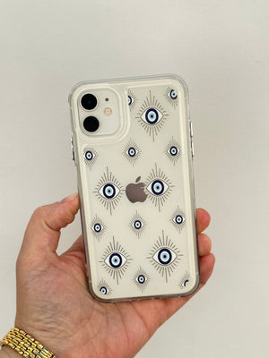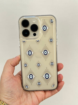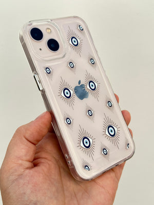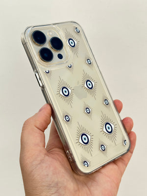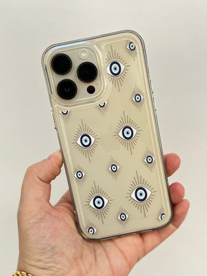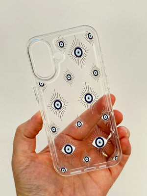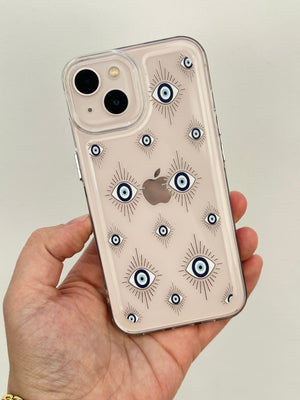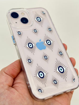 Bu şeffaf telefon kılıfı, üzerinde nazar boncuğu desenleriyle dikkat çekiyor. Farklı boyutlardaki çok sayıda mavi ve beyaz nazar boncuğu, kılıfın üzerinde rastgele bir şekilde dağılmış durumda. Nazar boncuklarının etrafında kirpik benzeri çizgiler bulunuyor, bu da desenlere hareketli bir hava katıyor. Kılıfın şeffaf olması, altındaki telefonun renginin hafifçe görünmesine olanak tanıyor.