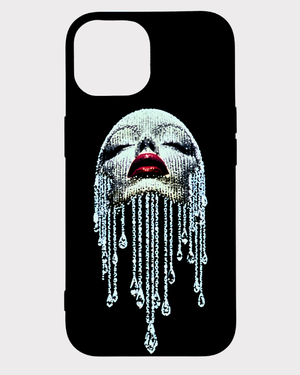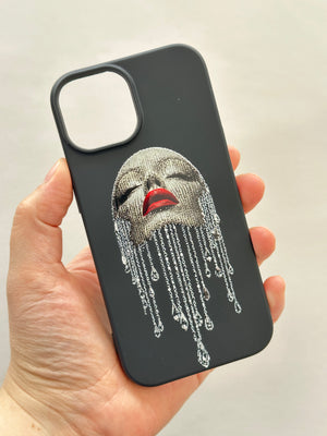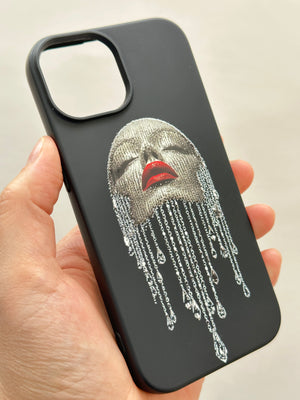 Bu siyah telefon kılıfının odak noktasında, gözleri kapalı, yüzü ışıltılı taşlarla veya bir tür metalik dokuyla kaplı bir kadın yüzü yer alıyor. Kadının dudakları parlak kırmızı renkte ve bu kontrast, tasarıma dramatik bir hava katıyor. Yüzünden aşağıya doğru akan, irili ufaklı parlak damlalar veya zincirler, sanki gözyaşları ya da değerli taşların eriyik hali gibi duruyor. Bu detay, tasarıma hem hüzünlü hem de gösterişli bir anlam katıyor.