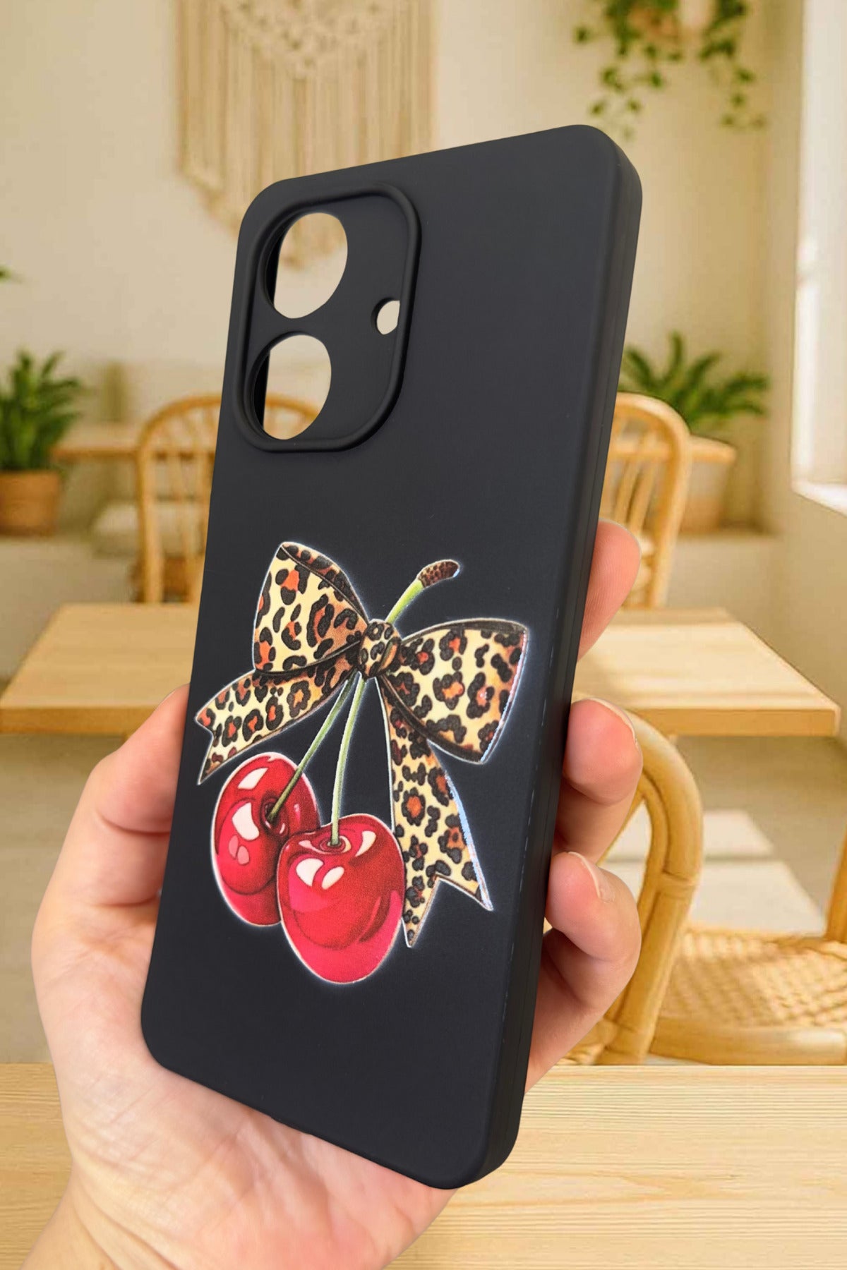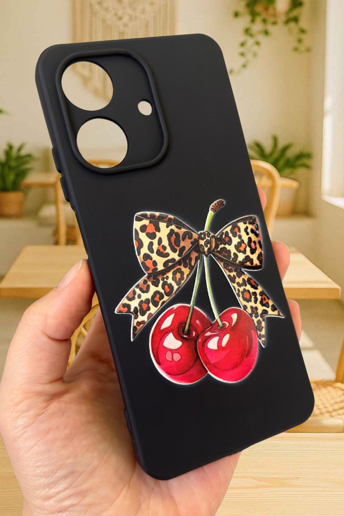 REALME NOTE 60 Uyumlu Kiraz Leopar Fiyonk Desenli Silikon Darbe Emici Rubber Kılıf