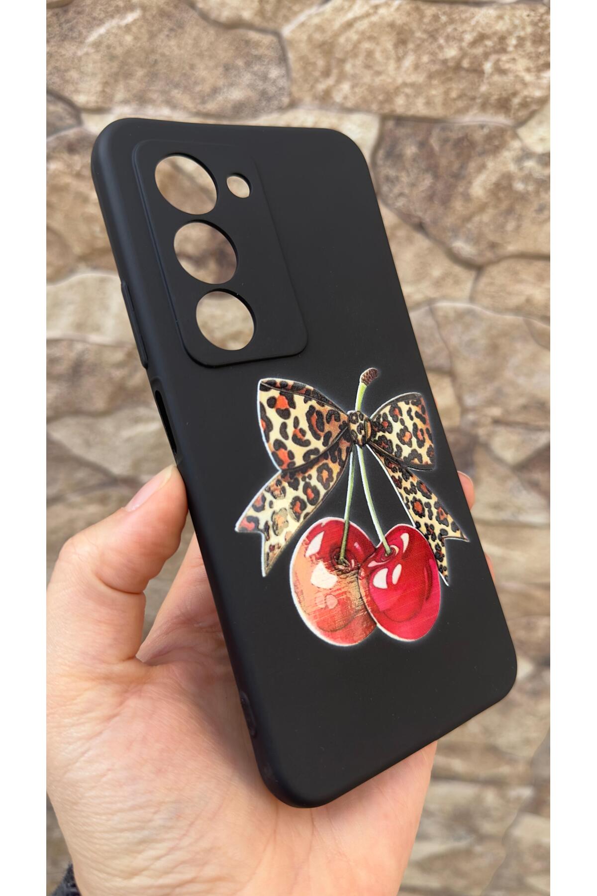 Redmi 15 Uyumlu Kiraz Leopar Fiyonk Desenli Silikon Darbe Emici Klasik Korumalı Rubber Kılıf