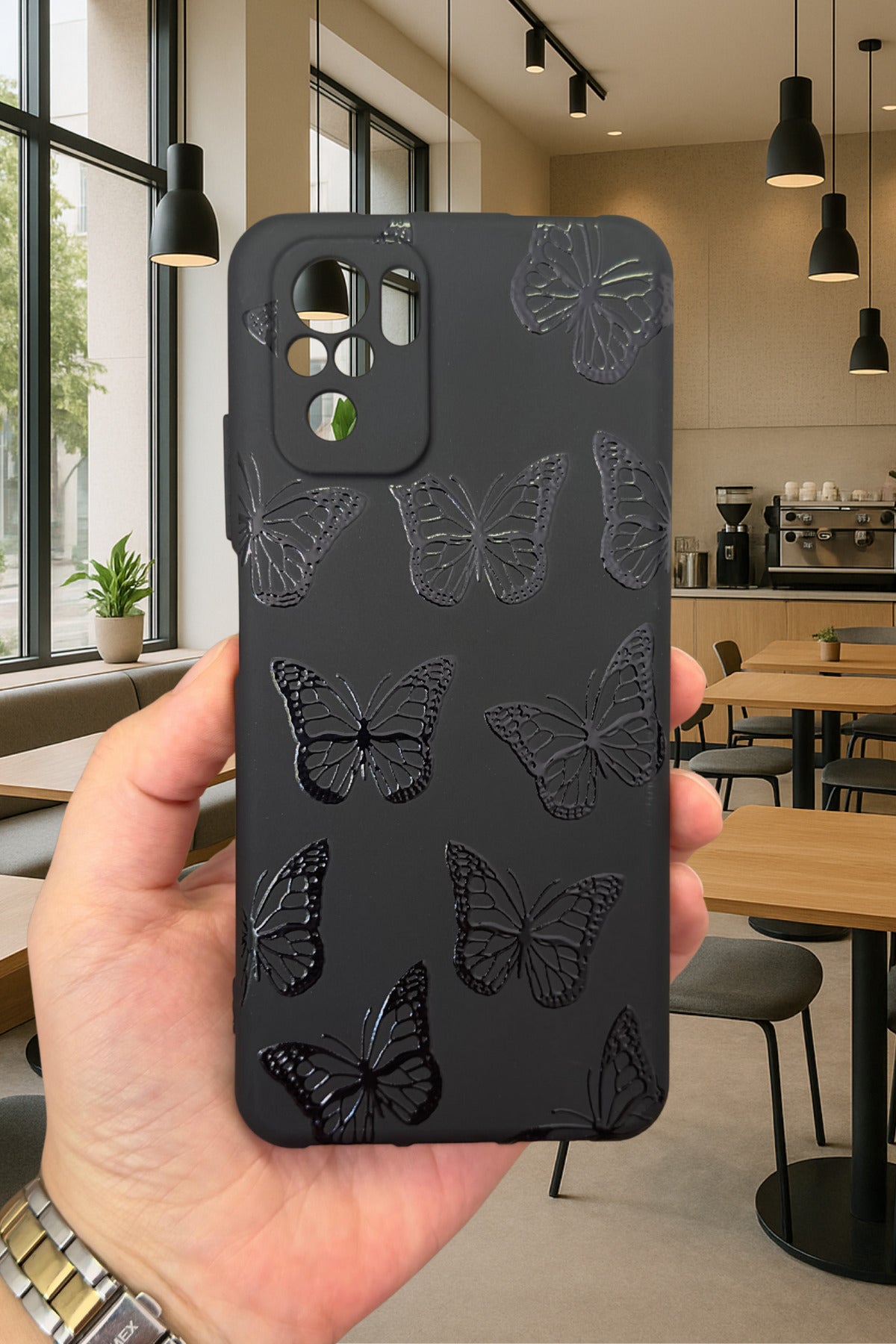 Redmi Note 10/10S Uyumlu SİYAH KELEBEK DESENLİ Silikon Darbe Emici Klasik Korumalı Rubber Kılıf