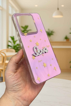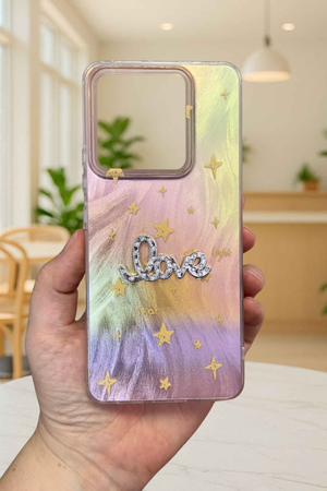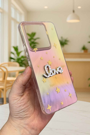 Redmi Note 13 Parlak Taşlı “Love” Yazılı Yıldız Desenli Telefon Kılıfı – Pastel Renkli Star Love Kılıf