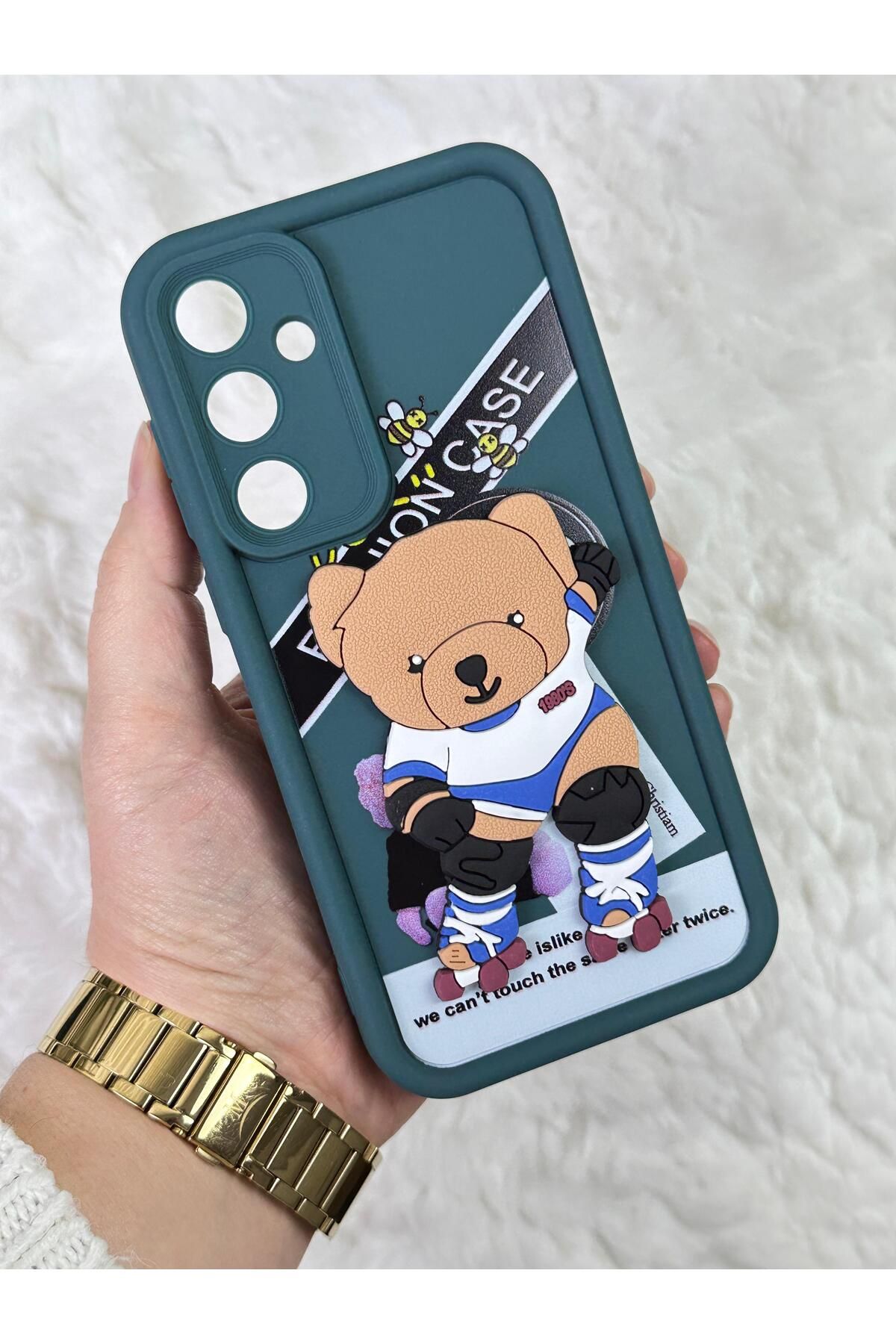 Silikonlu Lansman Ayıcıklı Kılıf, şık ve dikkat çekici tasarımıyla telefonunuzu hem korur hem de tarzınıza zarif bir dokunuş katar.; Yüksek kaliteli sert silikon malzemesi, darbeye karşı dayanıklılık sağlarken çizilmelere karşı güçlü bir koruma sunar.; Kılıfın üzerindeki sevimli ayıcık deseni, ürünün hem eğlenceli hem de modern bir görünüm kazanmasını sağlar.; Özellikle yeşil renk seçeneğiyle doğal ve ferah bir stil yakalayan bu model, cihazınıza tam uyum sağlayarak tüm bağlantı noktalarına ve düğmelere kolay erişim imkanı sunar.; Hem günlük kullanım hem de özel günler için ideal bir aksesuar olarak öne çıkar.; "