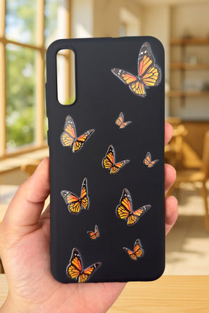 Samsung Galaxy A70 - Turuncu Kelebek Desenli Silikon Darbe Emici Klasik Korumalı Rubber Kılıf