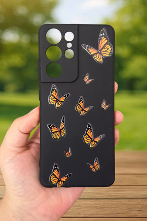 Samsung Galaxy S21 Ultra-Turuncu Kelebek Desenli Silikon Darbe Emici Klasik Korumalı Rubber Kılıf