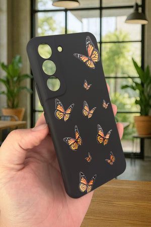 Samsung Galaxy S22-TURUNCU KELEBEK DESENLİ Silikon Darbe Emici Klasik Korumalı Rubber Kılıf