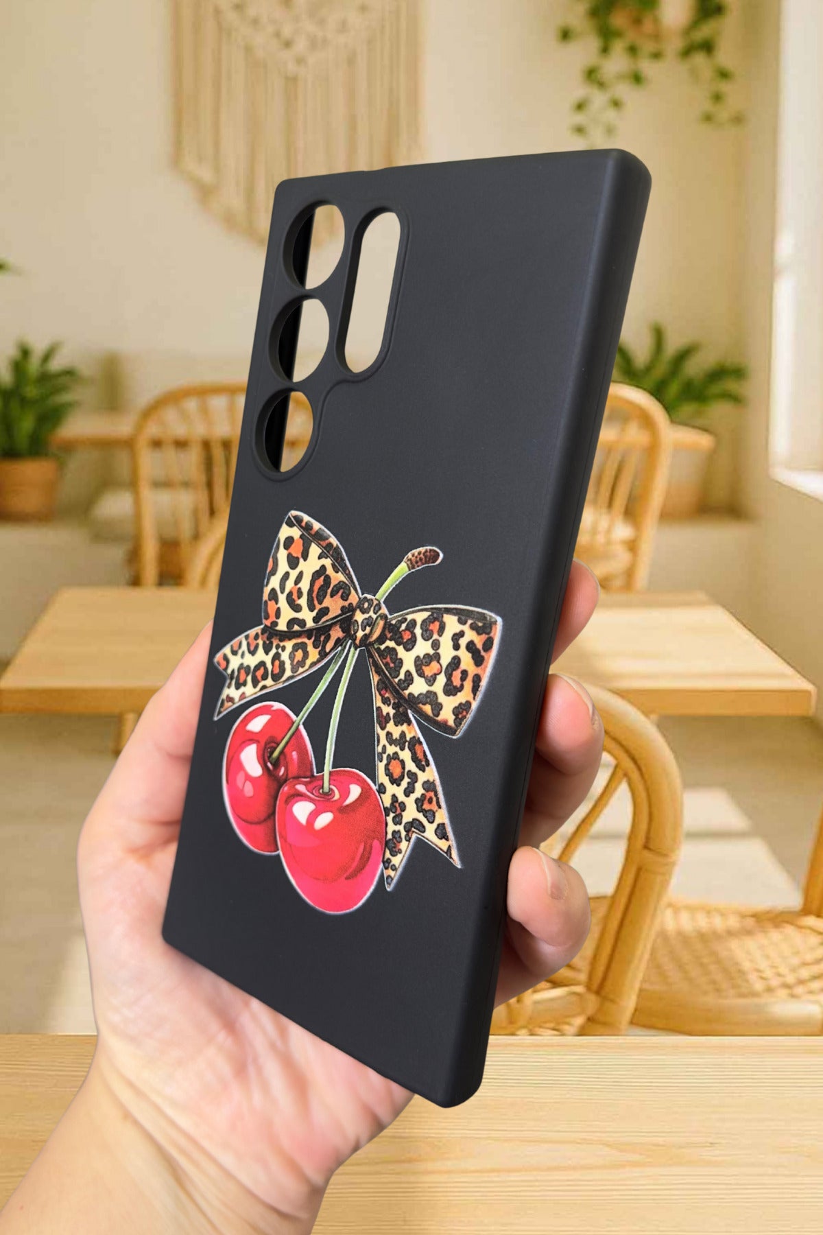 Samsung Galaxy S22 Ultra Uyumlu Kiraz Leopar Fiyonk Desenli Silikon Darbe Emici Rubber Kılıf