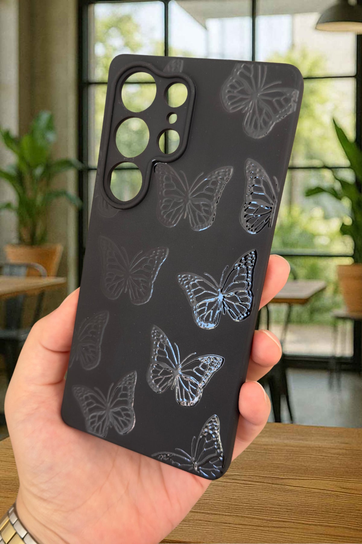 Samsung Galaxy S25 Ultra -Siyah Kelebek Desenli Silikon Darbe Emici Klasik Korumalı Rubber Kılıf