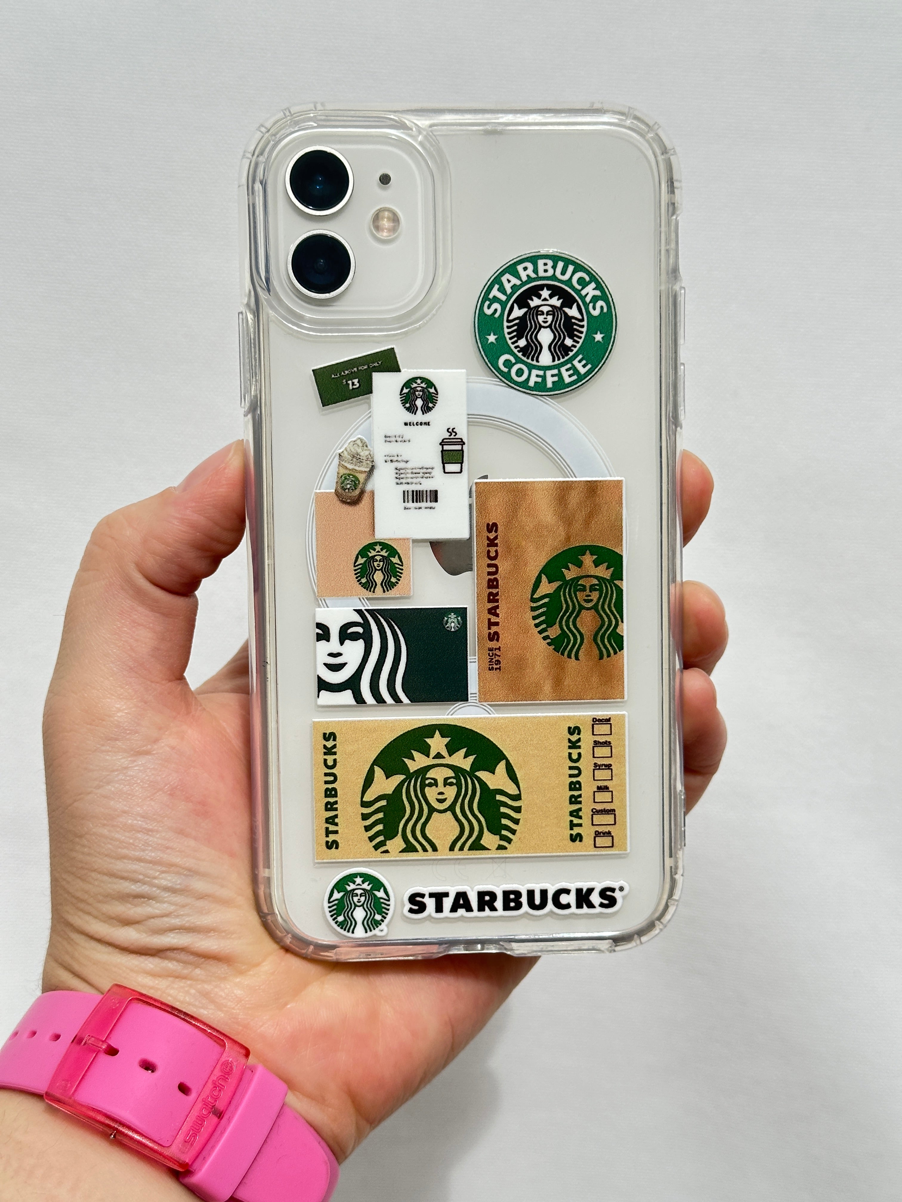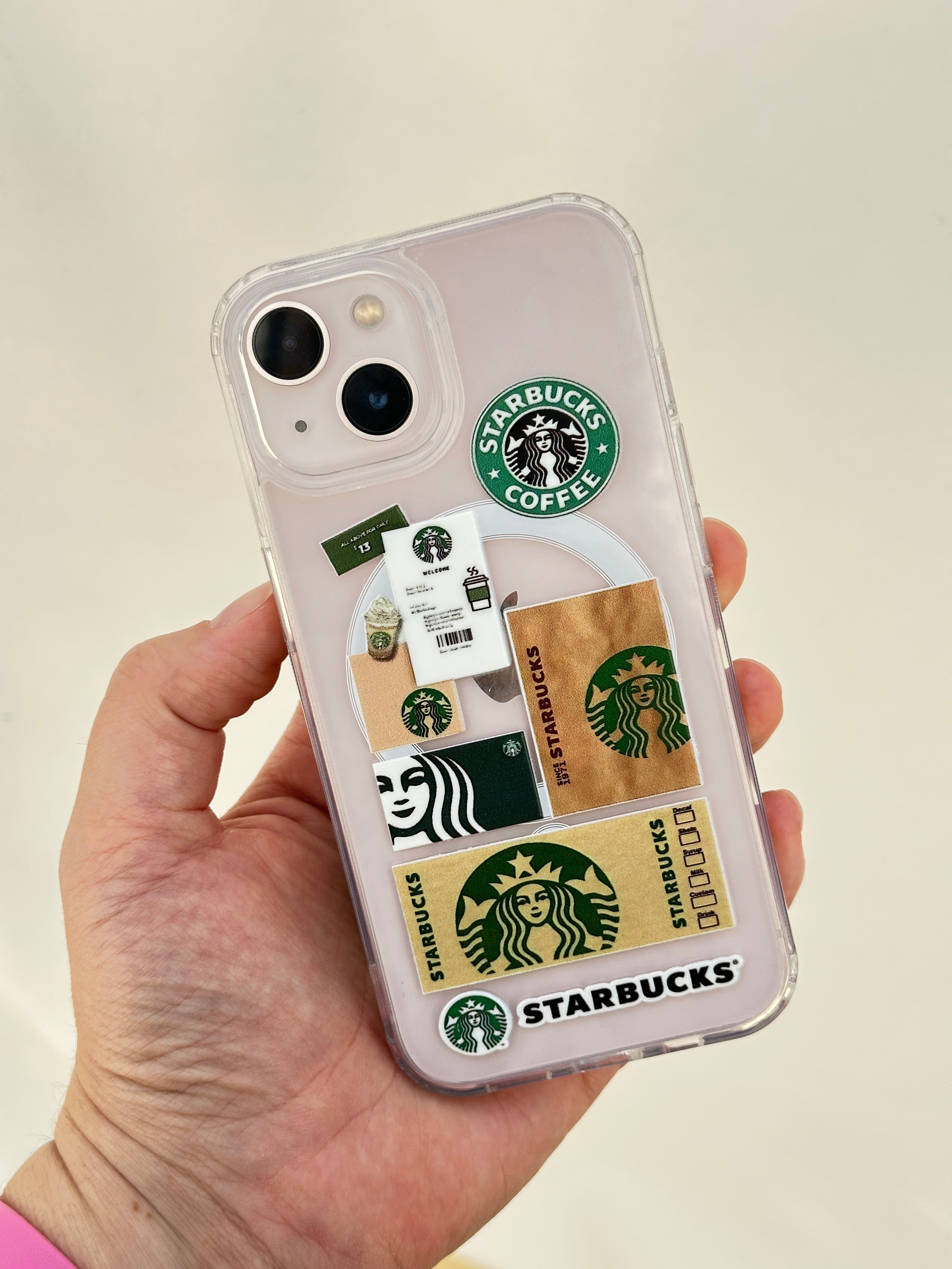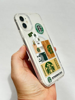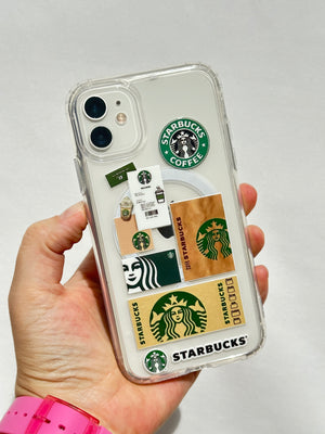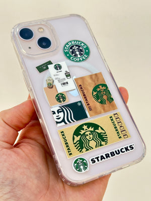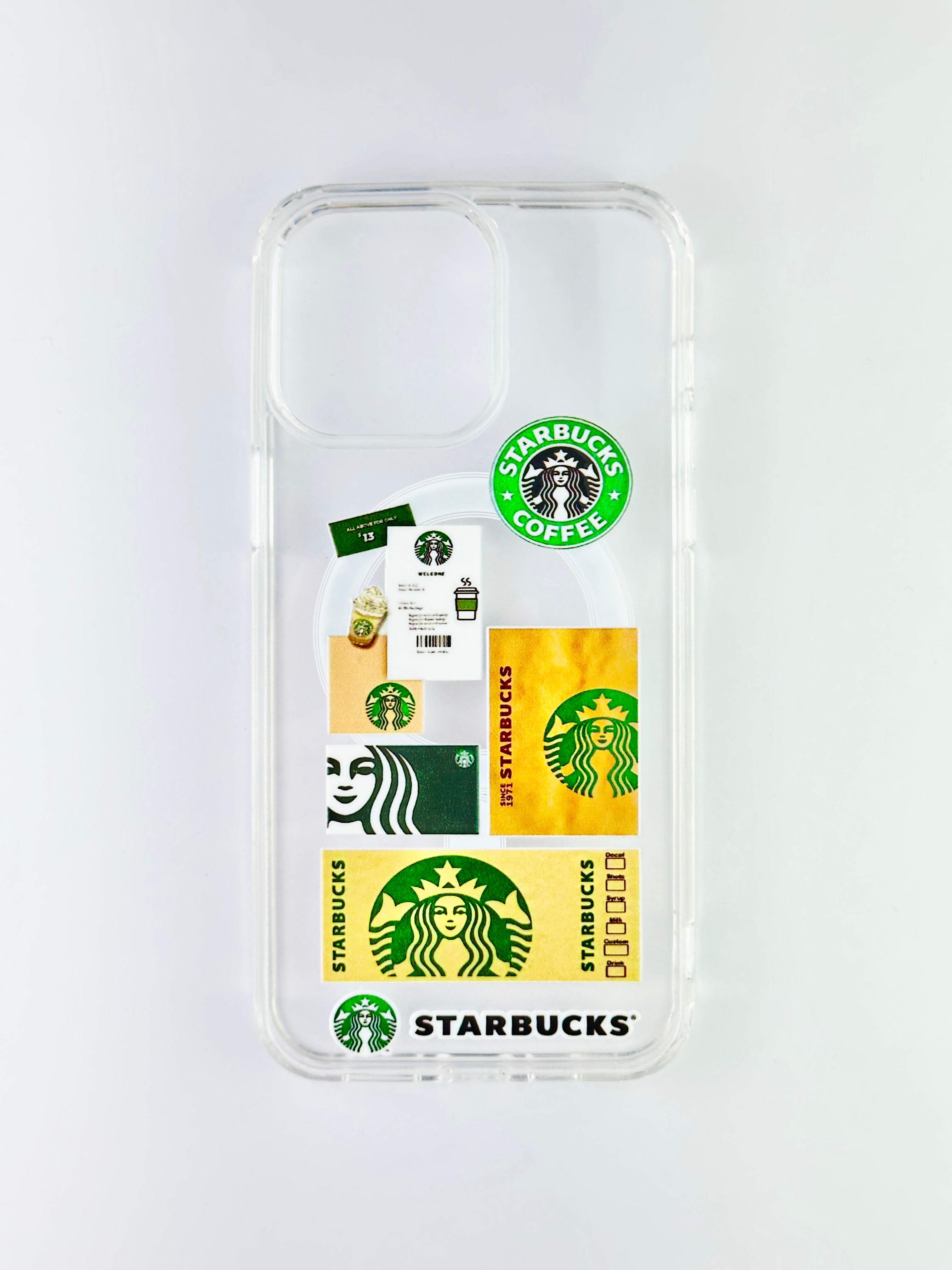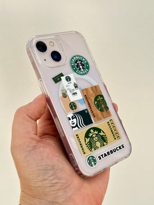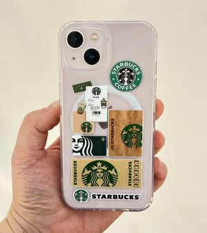 Bu şeffaf telefon kılıfı, popüler bir kahve zincirinin temalı öğeleriyle dolu, kolaj tarzında detaylı ve sevimli bir tasarıma sahip. Kılıfın üzerinde bu kahve zincirinin ikonik logosu, farklı boyutlarda ve renklerde birçok kez kullanılmış.