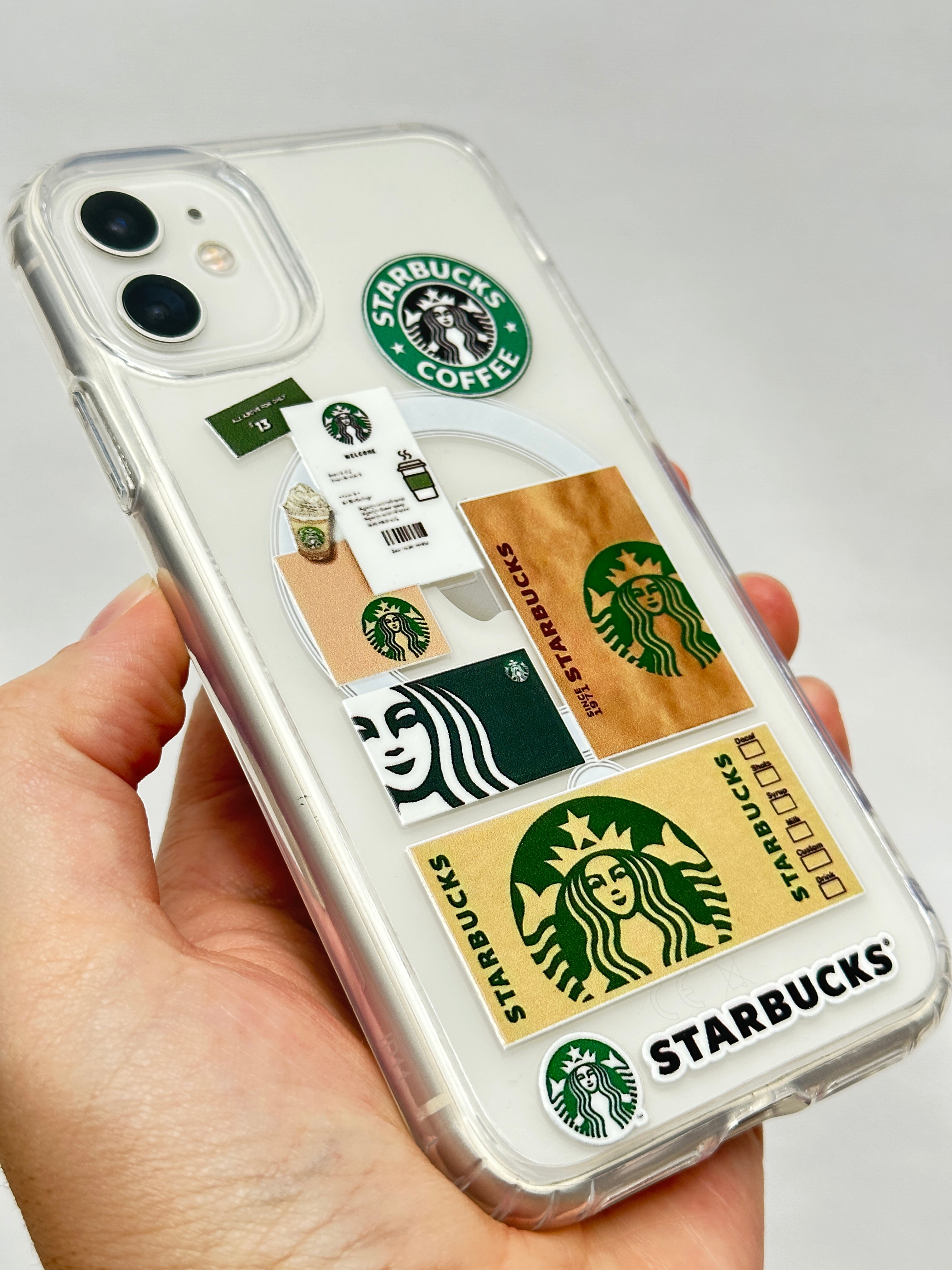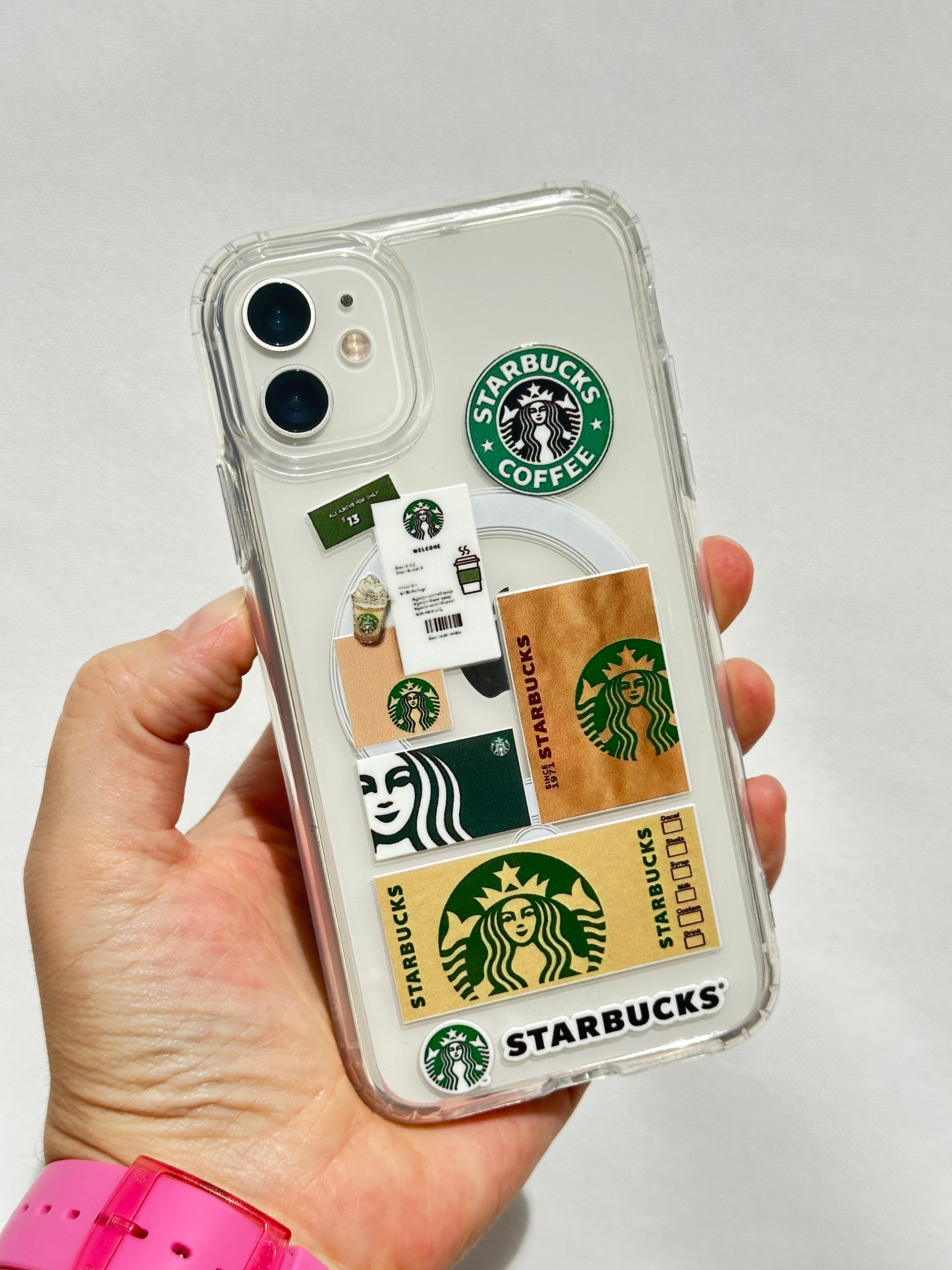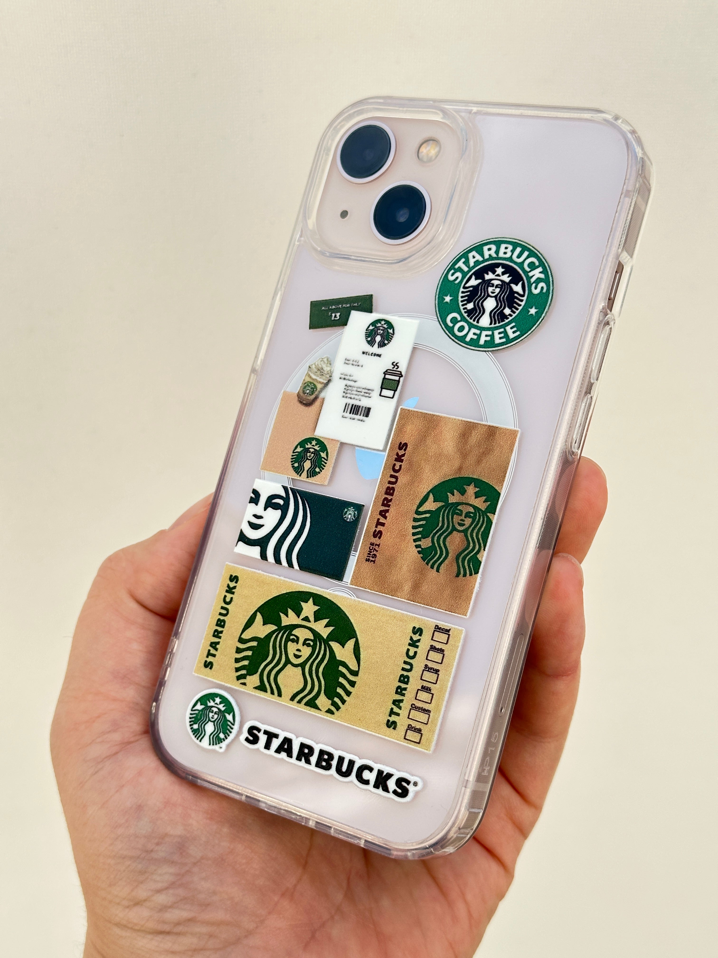 Bu şeffaf telefon kılıfı, popüler bir kahve zincirinin temalı öğeleriyle dolu, kolaj tarzında detaylı ve sevimli bir tasarıma sahip. Kılıfın üzerinde bu kahve zincirinin ikonik logosu, farklı boyutlarda ve renklerde birçok kez kullanılmış.