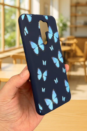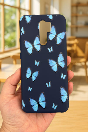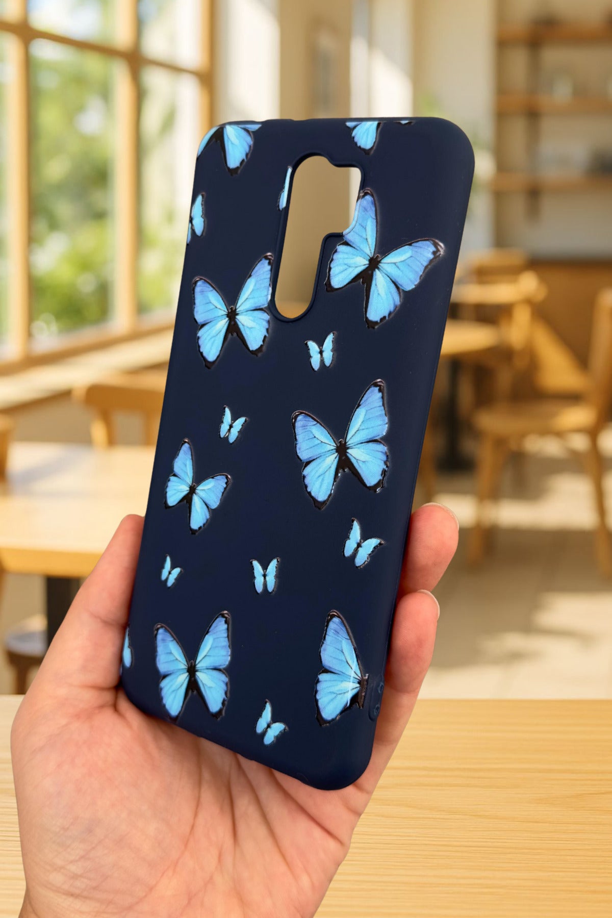 Xiaomi Redmi 9 Uyumlu Mavi Kelebek Desenli Silikon Darbe Emici Klasik Korumalı Rubber Kılıf