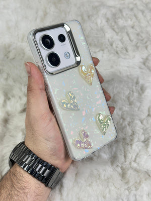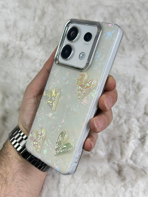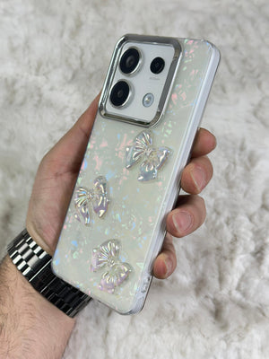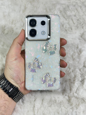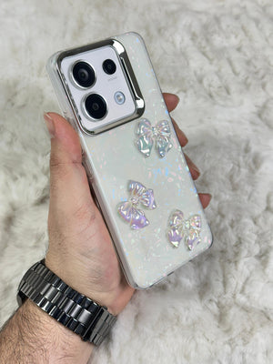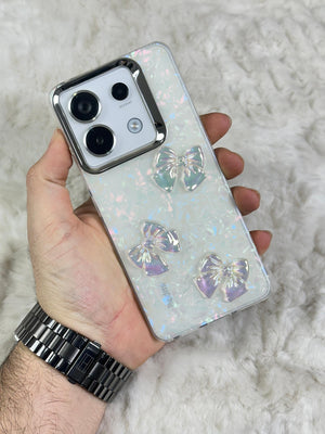Bu telefon kılıfı, zarif ve göz alıcı bir tasarıma sahip. Parlak, inci beyazı bir arka plan üzerine yerleştirilmiş üç adet şeffaf fiyonk detayına sahip. Fiyonklar, ışığa göre renk değiştiren bir yansıma efektine sahip, bu da kılıfa ışıltılı ve sofistike bir görünüm katıyor. Kılıfın köşeleri, telefonu koruyacak şekilde sağlam ve dayanıklı bir malzemeden yapılmış. Şık bir tasarım arayan ve cihazını çizilmelere, darbelere karşı korumak isteyenler için ideal bir aksesuar.
